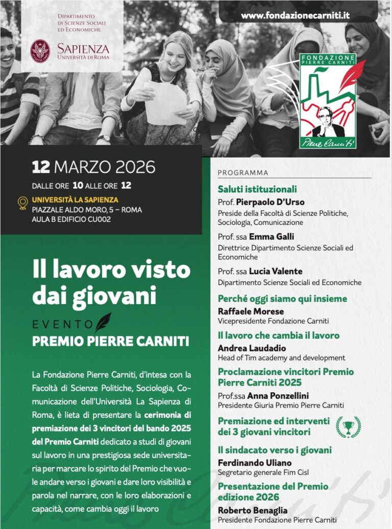 Desidero salutare i presenti, i miei studenti, e i rappresentanti della Fondazione Pierre Carniti che ha voluto scegliere la nostra facoltà e il nostro Dipartimento …