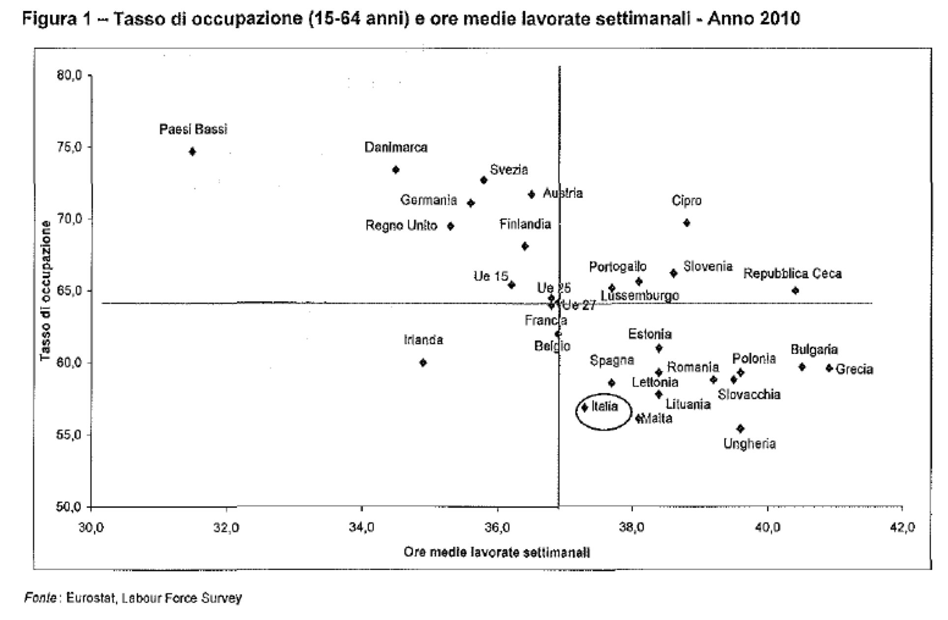 Si veda la Figura 1 (Istat 2011) che mette in relazione, per il 2010, il tasso di occupazione (15 – 64 anni) e le ore medie settimanali lavorate.