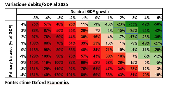 Questa valutazione negativa sarebbe aggravata dall’analisi dell’andamento congiunto del bilancio primario (ossia deficit pubblico al netto della spesa per interessi) rispetto al PIL e del corrispondente impatto sul rapporto debito/PIL. Nel 2017 il bilancio primario è stato dell’ordine del +2% del PIL (surplus). Come si può rilevare nella tabella, ove il bilancio primario fosse invece portato stabilmente al -4% del PIL (deficit) perfino una crescita del PIL nominale del 5% comporterebbe un ulteriore peggioramento del rapporto debito/PIL del 10%, con un debito/PIL che passerebbe dall’attuale 130% al 140% nel 2025. Per ottenere una riduzione del 25% del rapporto debito/PIL in sette anni con un surplus primario costante e simile a quello attuale occorrerebbe una crescita del PIL nominale di almeno il 4% annuo (area verde nella tabella).