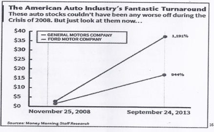 A fine 2013 la Borsa era affollata di offerte di vendita. Gli investitori interessati al settore dell’auto avrebbero avuto l’alternativa di General Motors, perché Il governo statunitense aveva annunciato la vendita dell’ultima quota di 31,1 milioni di azioni in suo possesso. Con l’uscita del governo la società si sarebbe liberata dai vincoli nella distribuzione di dividendi, una pratica che Ford, per non aver avuto aiuti dal governo, stata utilizzando con larghezza grazie agli utili che realizzava negli Stati Uniti e nonostante le perdite sul mercato europeo[18].