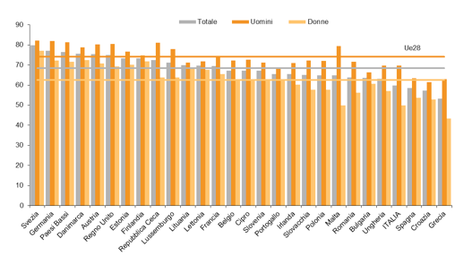 Fig. 1: Tasso di occupazione della popolazione in età 20-64 anni per sesso nei paesi Ue – Anno 2013 (valori percentuali)