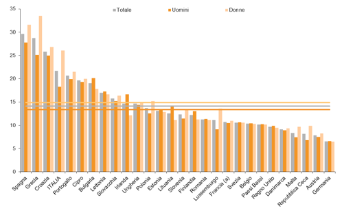 Fig. 2: Tasso di mancata partecipazione della popolazione in età 15-74 anni per sesso nei paesi Ue- Anno 2013 (valori percentuali)