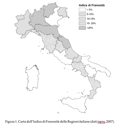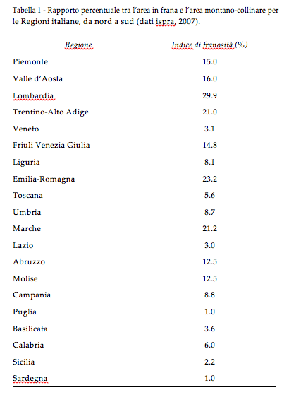 Tabella 1 – Rapporto percentuale tra l’area in frana e l’area montano-collinare per le Regioni italiane, da nord a sud (dati ispra, 2007).