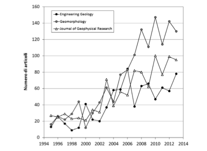 Figura 5 – Il costante aumento del numero di pubblicazioni scientifiche sul tema frane in tre prestigiose riviste di settore testimonia lo sforzo della ricerca negli ultimi 20 anni.