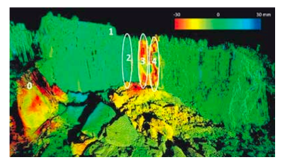 Figura 6 b – Mappa di spostamento ottenuto da interferometria radar terrestre eseguita dal Centro di Competenza del Servizio Nazionale di Protezione Civile dell’Università di Firenze. Le aree evidenziate indicano zone di attenzione carat- terizzate da particolare attività di movimento.