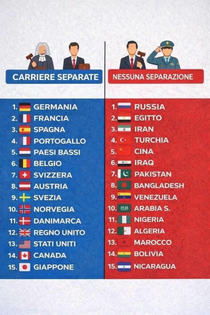 Ovviamente, la magistratura e lo stesso CSM non hanno dato sempre un’immagine di sobrietà, di rettitudine, di efficienza. Anche nei momenti più esaltanti come nella lotta alla mafia e alla criminalità organizzata, alla corruzione e alla difesa dei diritti individuali e collettivi, ci sono stati casi di devianze comportamentali di singoli magistrati, di errori clamorosi (uno per tutti, Tortora), di invasioni di campo, specie nei confronti della politica. Ma mettendole tutte assieme, queste vicende non configurano una combriccola che ha trasformato l’autogoverno in “un meccanismo para-mafioso” come ha affermato clamorosamente il Ministro Nordio; né sono sufficienti per giustificare una picconata dell’autonomia costituzionale di questo potere. Perché tale è per la Costituzione del nostro Paese e di tutti quelli a democrazia costituzionale. Mi è stata data una tabellina, che riporto in fondo pagina, in cui si dimostra che i Paesi senza separazione delle carriere sono tutti o dittature o democrature. Su un’altra colonna i Paesi a democrazia liberale dove c’è la separazione. E’ un messaggio distorcente. Essa spiega soltanto che nei primi non c’è autogoverno della magistratura e quindi equilibrio tra i tre classici poteri legislativo, esecutivo e giudiziario. Nei secondi dipende dalle Costituzioni vigenti.