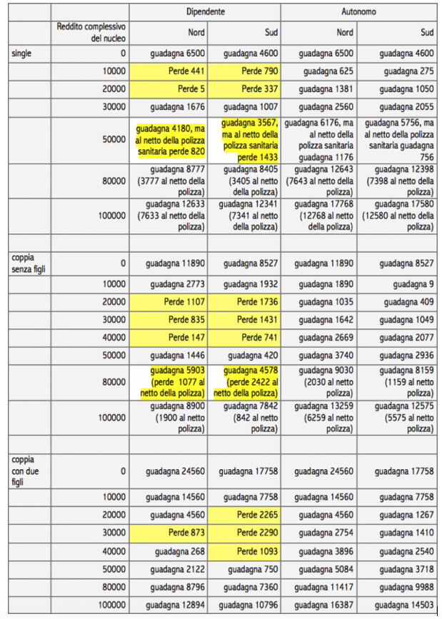 Fonte: www.25xtutti.it; per semplicità abbiamo assunto che la polizza sanitaria costi 5mila per una persona sola e 7mila per una coppia senza figli e si paghi oltre 5 volte il minimo vitale calcolato tenendo conto delle maggiorazioni per carichi familiari. Nel caso di coppie, il reddito è uguale per i due coniugi.
