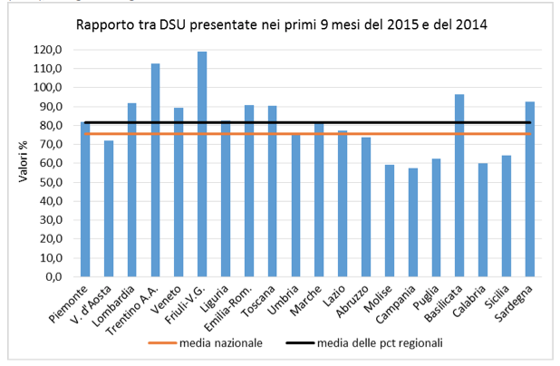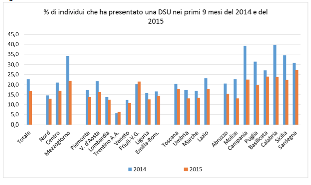 Per quanto riguarda il confronto regionale tra le percentuali di presentazione di DSU tra 2014 e 2015, vedi il grafico seguente