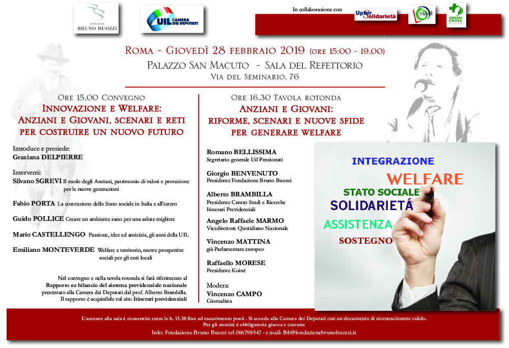 Il convegno avrà come tema “Innovazione e welfare: anziani e giovani, scenari e reti per costruire un nuovo futuro” (discussant Silvano Sgrevi, Fabio Porta, Guido Pollice, Mario Castellengo ed Emiliano Monteverde; presiede Graziana Delpierre), mentre l’argomento della tavola rotonda sarà “Anziani e giovani: riforme, scenari e nuove sfide per generare welfare” (discussant Romano Bellissima, Giorgio Benvenuto, Alberto Brambilla, Angelo Raffaele Marmo, Enzo Mattina, Raffaele Morese; modera Vincenzo Campo).