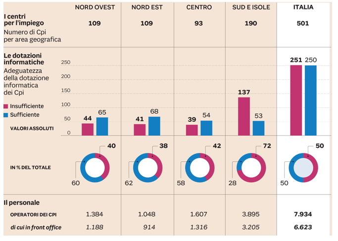 Nella rete dei 501 Cpi, la metà ha dotazioni informatiche insufficienti (il 72% nel Sud e nelle Isole), per gli organici c’è un problema quantitativo e qualitativo: molti dei 7.934 dipendenti (contro i 98.739 addetti della Germania, i 74.080 del Regno Unito, i 54mila della Francia e gli 8.945 della Spagna), per effetto del blocco del turn over hanno un’età avanzata, una scarsa dimestichezza con il digitale, sono abituati a svolgere compiti puramente burocratici – complici le scelte dei governi che hanno privilegiato gli investimenti per le politiche passive -, non hanno avuto la formazione necessaria per rispondere alle nuove sfide delle politiche attive. Tuttavia i Cpi funzionanti sono il presuposto per un reddito di cittadinanza che non si risolva in puro assistenzialismo, visto che i centri dovranno proporre offerte di lavoro ai beneficiari del sussidio: è in gioco la condizionalità della misura. In generale prevale un clima di sfiducia (solo il 3,4% ha trovato lavoro con i Cpi), ma non mancano alcune eccellenze, soprattutto nel Centro Nord.