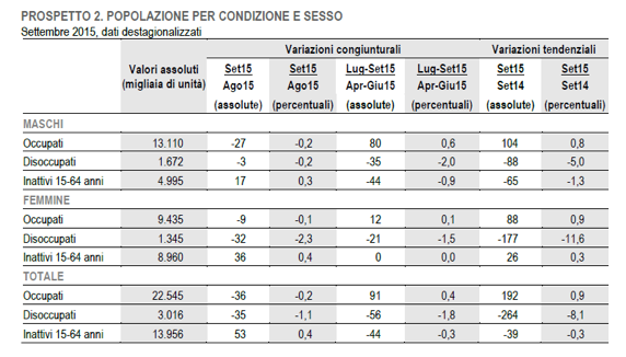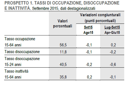 –  a settembre 2015 diminuiscono gli occupati (- 0,2%, – 36mila), mentre tra giugno e agosto erano aumentati (+ 0,7%, + 166mila); su base annua l’occupazione è a + 0,9%, + 192.000 occupati;