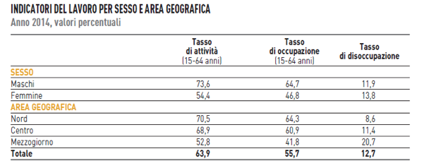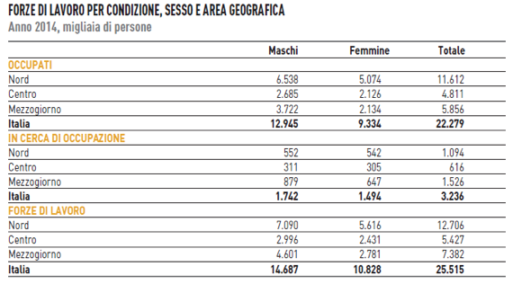 La tabella che segue, relativa al 2014, ci permette di leggere i dati delle forze di lavoro per condizione, sesso e area geografica: