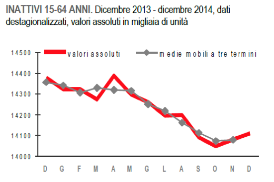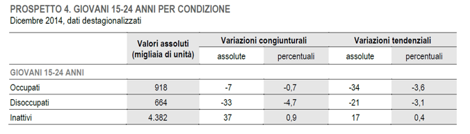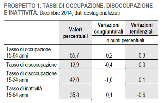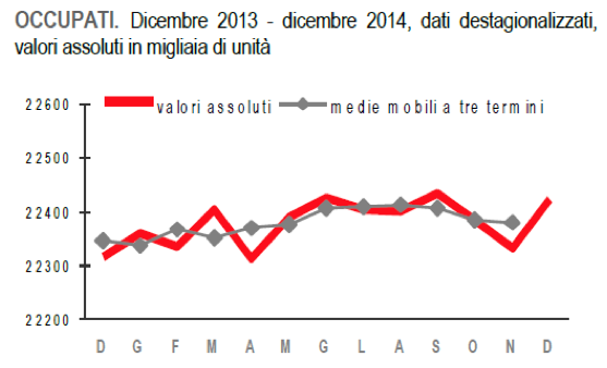A dicembre 2014 gli occupati erano 22 milioni 422 mila: dopo il calo nei due mesi precedenti, l’occupazione a dicembre aumenta dello 0,4% (+93 mila). Su base annua la crescita è dello 0,5% (+109 mila).