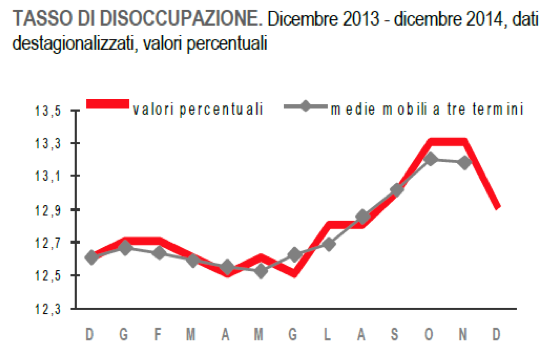 Il tasso di disoccupazione a dicembre scende al 12,9%, ( – 0,4 punti percentuali in termini congiunturali). Il calo osservato nell’ultimo mese è il primo segnale di contrazione della disoccupazione dopo un periodo di crescita. Eurostat fa rilevare come la riduzione del tasso di disoccupazione italiana sia la più rilevante di tutta l’UE.