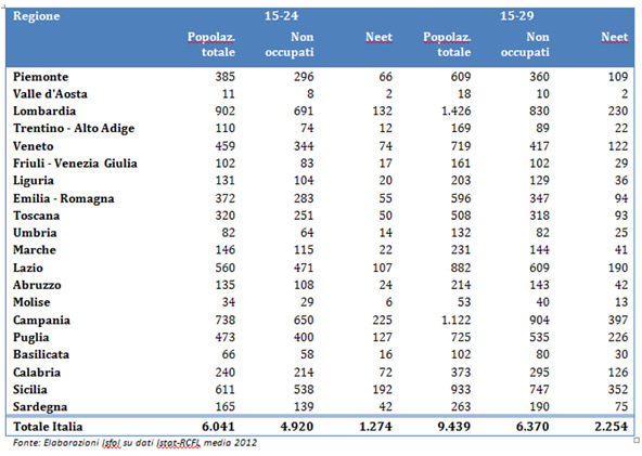 Lo stock di giovani tra i 15-24 anni ammonta a 6.041.000 unità. Di questi, 1.274.000 non lavorano e non frequentano corsi di istruzione o formazione, quindi sono inoccupati/disoccupati e inattivi. Ampliando la popolazione di riferimento fino a 29 anni, il numero di coloro i quali non lavorano (inoccupati/disoccupati e inattivi) e non frequentano alcun corso di istruzione o formazione (i cosiddetti NEET) è pari a 2.254.000 unità, su un totale di 9.439.200 giovani.