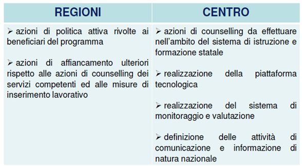 L’introduzione della “Garanzia per i Giovani” nel nostro Paese è una sfida che necessita di una strategia unitaria, fortemente condivisa tra Stato, Regioni ed altri soggetti pubblici e privati. Di conseguenza, accanto ad un Piano che individui le azioni comuni su tutto il territorio nazionale (Programma Operativo Nazionale), ciascuna Regione, in quanto organismo intermedio (ossia gestore “delegato”), deve definire un proprio piano attuativo, in linea con le disposizioni centrali.