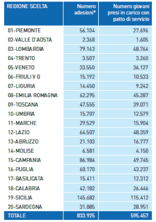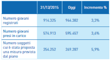 Al 28 gennaio 2016,il numero degli utenti complessivamente registrati ha superato le 944 mila unità, di cui 595 mila, circa il 63%, sono stati presi in carico dai soggetti autorizzati (centri per l’impiego o enti privati accreditati), nel senso che i giovani hanno svolto almeno un colloquio di orientamento e hanno firmato un Patto di attivazione. Di questi, circa 269mila, pari al 44%, ha ricevuto una misura prevista dal piano. La più diffusa tra le misure utilizzate consiste nel tirocinio retribuito.