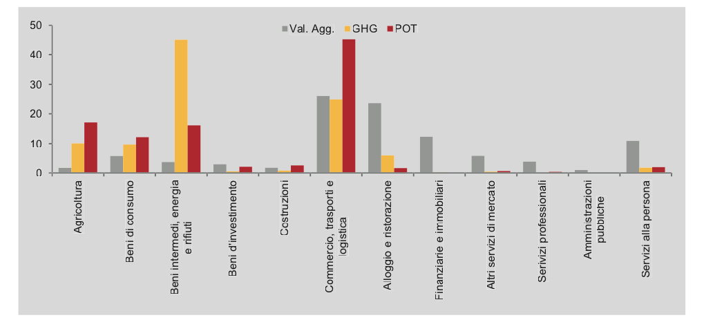 In particolare, normalizzando a 100 la riduzione del valore aggiunto e delle emissioni, nei settori del commercio, trasporti e logistica si concentrerebbe circa un quarto della riduzione del valore aggiunto e delle emissioni GHC e il 45% della riduzione di POT. Le emissioni di GHC registrerebbero il valore più elevato nei beni intermedi, energia e rifiuti (45%).