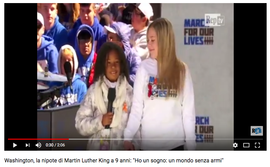 A 9 anni, la nipote di Martin Luther King, Yolanda Renee, è salita a sorpresa sul palco della marcia per il controllo delle armi a Washington, e ha citato il nonno dicendo di avere anche lei un sogno: “Un mondo senza armi”. Poco distante, il National Mall dove il nonno, nell’agosto 1963, tenne il celebre discorso “I Have a Dream” auspicando la fine del razzismo negli Stati Uniti. “Mio nonno aveva un sogno, che i suoi quattro figli non fossero giudicati per il colore della loro pelle ma per il loro carattere. Io ho un sogno che questo sia un mondo senza armi”, ha detto la bambina, trascinando poi la folla in un canto: “Spargete la voce che avete sentito, in tutto il paese, noi saremo una grande generazione”.