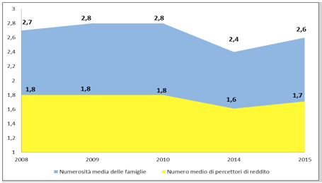 - – Composizione delle famiglie: le famiglie marchigiane risultano composte da una media di 2,6 elementi per nucleo, di cui 1,7 risultano percettori di reddito. Se si prendono in considerazione i soli redditi da lavoro, i membri percettori di reddito per ciascuna famiglia scendono a 1,09 unità. Nonostante l’attuale periodo di crisi economica, che persiste ormai da diversi anni, le famiglie tendono comunque a diventare sempre più piccole, mostrando una progressiva riduzione del numero medio dei componenti, anche se il 2015 appare in controtendenza rispetto al passato.