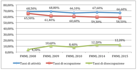 Figura 4: Evoluzione dei Tassi di attività, occupazione e disoccupazione regionali (15-64 anni)