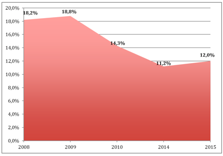 - –Precari: La quota di chi lavora con contratti a termine (parasubordinati e a tempo determinato) sul totale dei lavoratori subordinati raggiunge, nelle Marche, il 12%, un dato che risulta in leggera ascesa rispetto al 2014 (+0,8%) ma nettamente più basso rispetto alle precedenti rilevazioni, quando nel 2009 ha raggiunto il 18,8%.