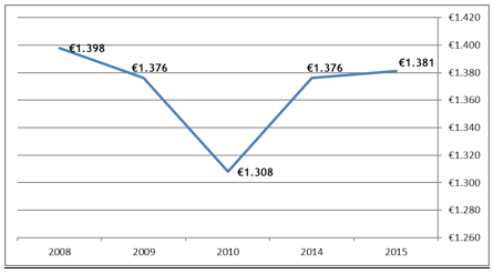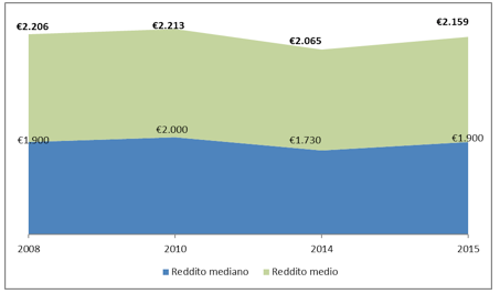 - –Reddito mediano e reddito equivalente: Il reddito mediano nel 2015 è di 1.900 euro, ritornando di fatto al valore del 2008, dopo che nell’anno precedente aveva toccato il livello più basso a quota 1.730 euro, mentre il reddito equivalente medio calcolato sui nuclei familiari è di 1.263 euro (€ 1..180 lo scorso anno).
