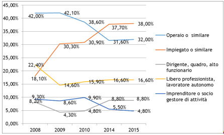 - –Qualifica: Più della metà degli occupati lavora come operaio o impiegato, ma mentre i primi sono andati via via riducendosi negli anni, gli impiegati sono notevolmente aumentati, passando dal 16,7% del 2008 all’attuale 31,3%.