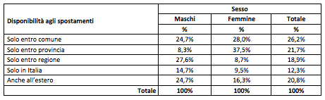 Tabella 1: Disponibilità agli spostamenti per sesso (valori %).