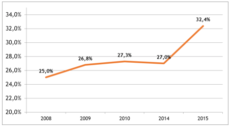 - –Indebitamento: Dopo un progressivo calo nel periodo 2008-2010, si registra anche quest’anno un aumento marcato della percentuale di famiglie indebitate: nel 2015 la quota di famiglie indebitate sul totale della popolazione è pari al 37,6%, praticamente lo stesso livello registrato nel 2008 (37,8%), mentre nel 2010 era scesa al 32.6%. Rispetto al passato, il livello di indebitamento delle fasce d’età medie risulta costantemente elevato (circa una famiglia su due ha debiti), mentre diminuiscono le famiglie di giovani costrette a chiedere prestiti. Al contrario, sono sempre più spesso le famiglie di ultra 64enni a dover sopportare ancora il peso di un mutuo, anche se in misura comunque inferiore a quelle delle famiglie meno mature. Tale spostamento di età può essere letto in parte dal fatto che le giovani generazioni, non avendo redditi certi, non possono accendere mutui per l’acquisto di un’abitazione e chiedono sempre più spesso l’intervento dei genitori o dei nonni, che si indebitano per poter garantire loro un futuro.