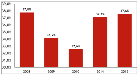 - –Indebitamento: Dopo un progressivo calo nel periodo 2008-2010, si registra anche quest’anno un aumento marcato della percentuale di famiglie indebitate: nel 2015 la quota di famiglie indebitate sul totale della popolazione è pari al 37,6%, praticamente lo stesso livello registrato nel 2008 (37,8%), mentre nel 2010 era scesa al 32.6%. Rispetto al passato, il livello di indebitamento delle fasce d’età medie risulta costantemente elevato (circa una famiglia su due ha debiti), mentre diminuiscono le famiglie di giovani costrette a chiedere prestiti. Al contrario, sono sempre più spesso le famiglie di ultra 64enni a dover sopportare ancora il peso di un mutuo, anche se in misura comunque inferiore a quelle delle famiglie meno mature. Tale spostamento di età può essere letto in parte dal fatto che le giovani generazioni, non avendo redditi certi, non possono accendere mutui per l’acquisto di un’abitazione e chiedono sempre più spesso l’intervento dei genitori o dei nonni, che si indebitano per poter garantire loro un futuro.