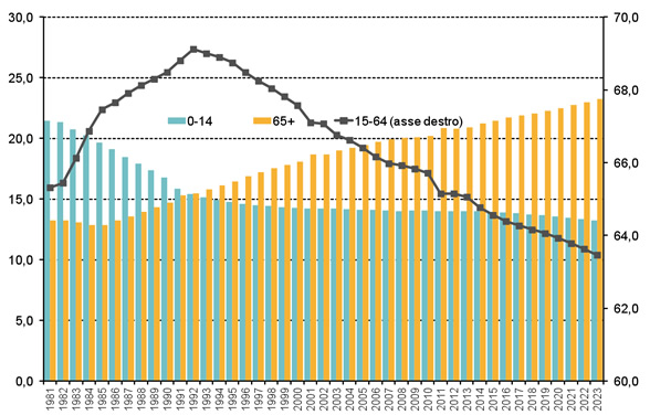 Dalla figura 1 si può osservare che per tutti gli anni ottanta la quota di bambini tra zero e quattordici anni era superiore alla percentuale di anziani (con più di 64 anni). Dagli anni novanta si inverte la proporzione.