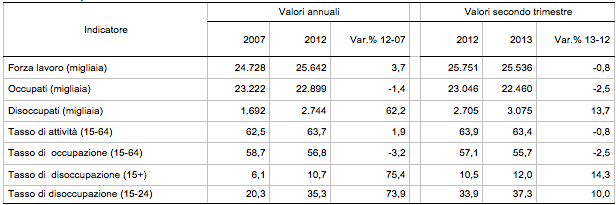 A questi cambiamenti strutturali nel 2008 si è inserita la crisi economico-finanziaria più grave e duratura dal secondo dopo guerra. Nel 2013 l’Italia è ancora immersa in una profonda contrazione della domanda interna e della produzione, mentre la ripresa si prevede non arriverà prima del 2014 e verosimilmente sarà molto lenta. La difficile situazione non ha lasciato indifferente il mercato del lavoro: la disoccupazione è al 12% nel secondo trimestre del 2013 (tabella 1), praticamente è raddoppiata dal 2007 raggiungendo il picco massimo da quando ci sono le rilevazioni Istat (1977).