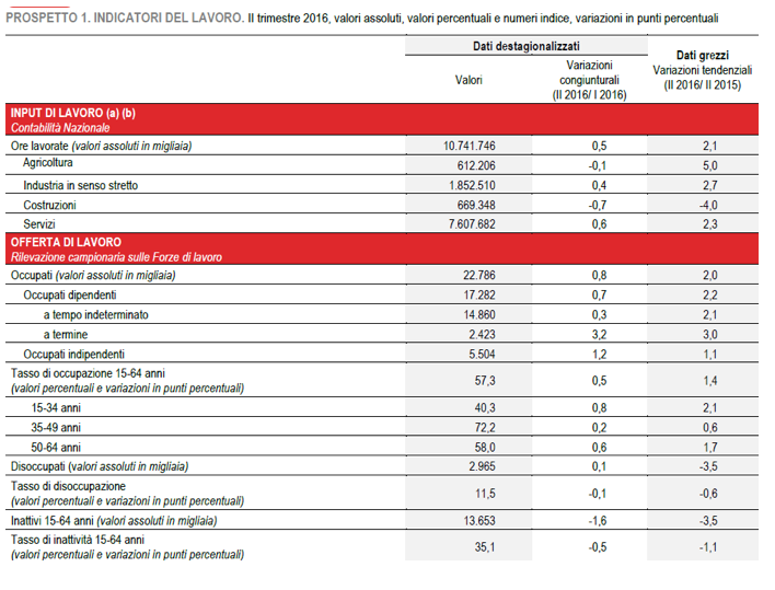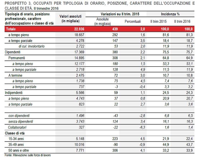 Il Prospetto 3 sottoriportato rappresenta una fotografia dei dati tendenziali (variazioni 2° trim. 2016 rispetto al 2° trim. 2015) degli occupati per alcune tipologie indicate: