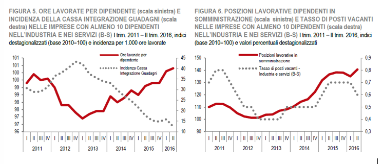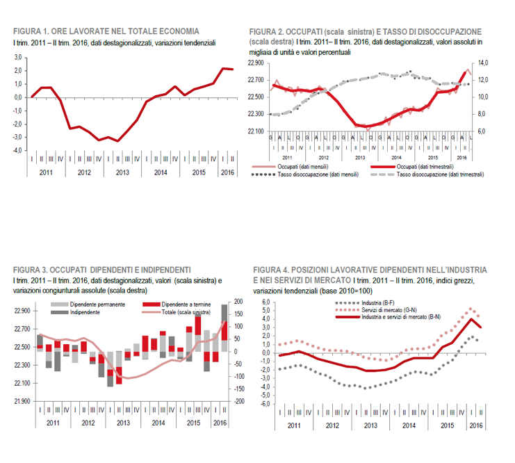 Nel secondo trimestre 2016 la nostra economia ha rallentato, in linea con le tendenze internazionali. Il Pil non ha avuto variazioni congiunturali, mentre ha avuto una variazione tendenziale del + 0,8% sullo stesso periodo dello scorso anno. Sono migliorati invece gli indicatori del lavoro, come si vede complessivamente nel Prospetto 1: sono aumentate le ore lavorate (tendenziali + 2,1%), gli occupati sono cresciuti di + 189.000 unità sul trimestre precedente (+ 0,8%), mentre la crescita su base annua ha raggiunto le 439 mila unità in più (+ 2,0%).