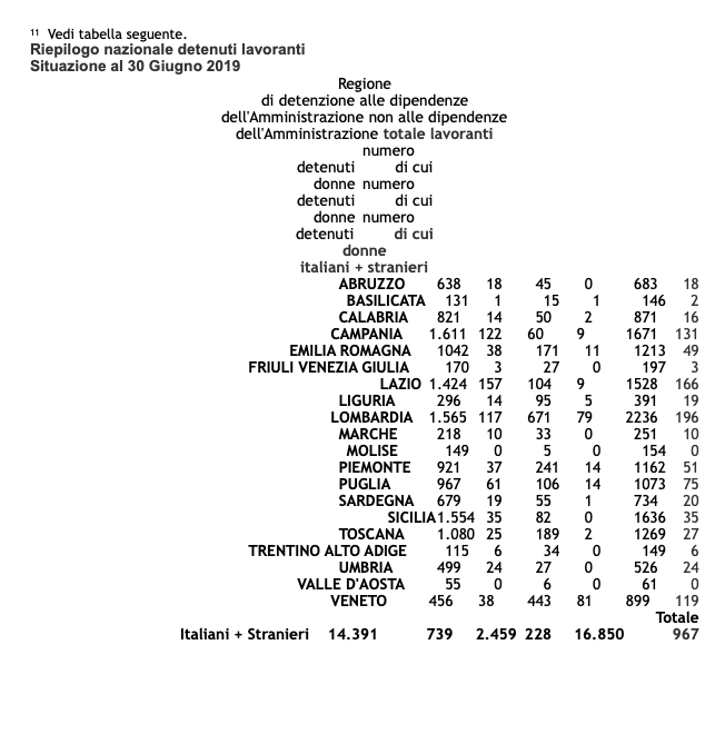 L’attività lavorativa al 30 giugno 2019 (dati Ministero Giustizia) viene svolta da 16.850 soggetti di cui 967 donne. Gli stranieri sono 5782. Ma questa attività solo per 2.459 detenuti si svolge non alle dirette dipendenze dell’amministrazione penitenziaria, in cooperative o altri enti, con maggiori possibilità di qualificazione rispetto allo sbocco nel mercato del lavoro.