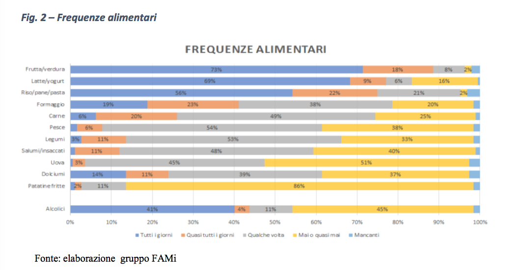 Per quanto riguarda le abitudini a tavola, gli anziani mantengono una dieta tipicamente mediterranea: consumano quotidianamente frutta, verdura e carboidrati (pasta, riso, pane). Il confronto di genere mette in luce come le donne tendano maggiormente a seguire sane abitudini rispetto agli uomini. Anche lo status economico si associa, in genere, con le abitudini più salutari. Una problematica che emerge è il consumo molto elevato di formaggi: il 42% li mangia tutti i giorni o quasi. Poco frequente invece il consumo di legumi, pesce e uova. Il consumo di vino è per molti quotidiano, ma rimane inferiore al bicchiere al giorno.