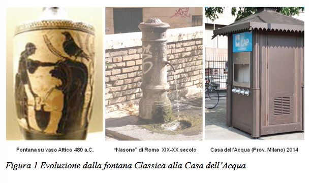 Stiamo parlando delle Case dell’Acqua, sistemi automatici che erogano al pubblico acqua dell’acquedotto refrigerata e/o gassata, dotati pertanto di semplici unità di trattamento.  Si possono anche considerare come l’evoluzione nel tempo dalla fontana classica, alla fontana del terzo millennio (figura 1); al riguardo il nostro Paese, dispone di solidi presidi tecnologico/manifatturieri in grado di sostenere la loro diffusione oltre che in Italia anche all’estero.
