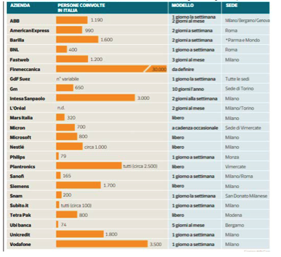 Un elenco non esaustivo di imprese che hanno adottato il lavoro agile è il seguente (vedi Silvia Stefanovichij)