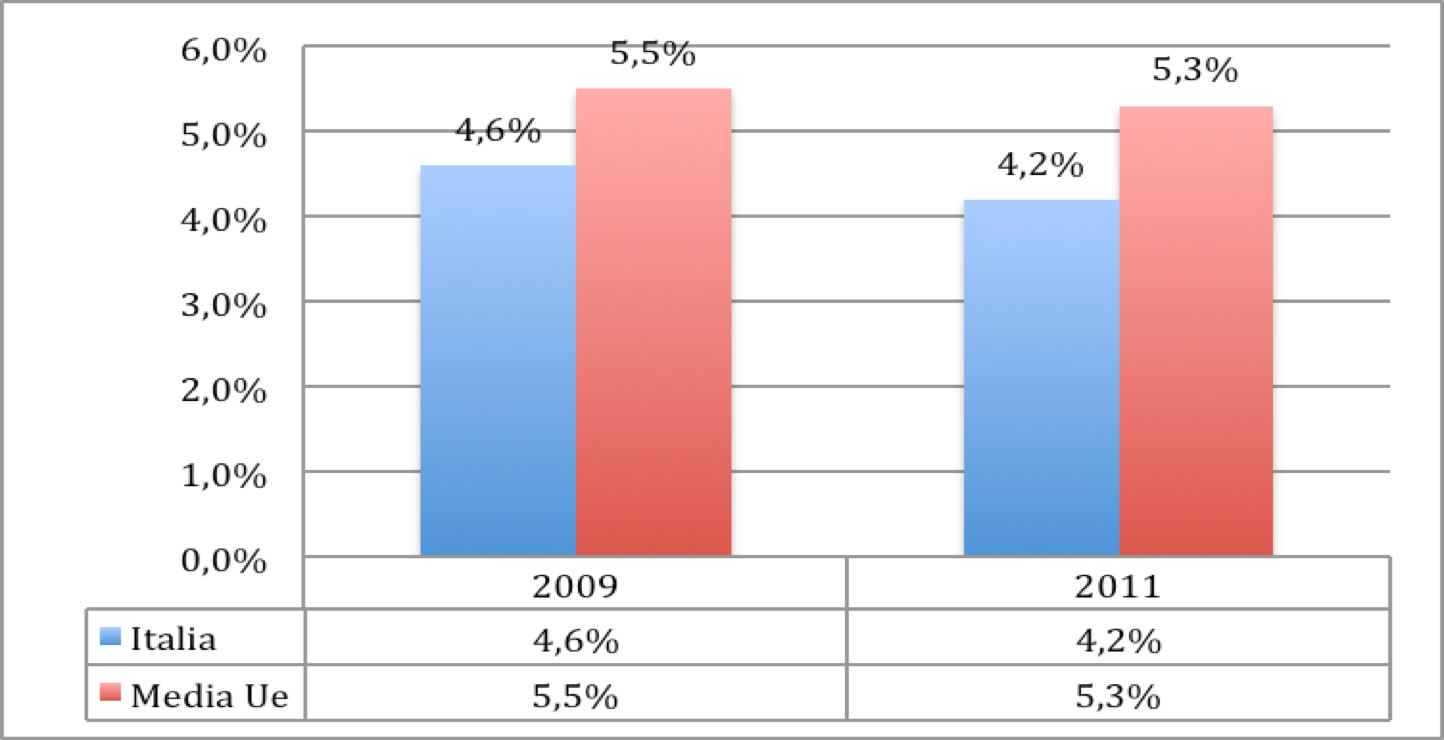 In linea generale, i vincoli di spesa hanno avuto un considerevole impatto sul settore dell’istruzione. Rispetto agli altri Paesi europei, in Italia, la spesa pubblica per l’istruzione è apparsa tra le più basse d’Europa (in percentuale del PIL, nel 2011 la spesa media in Italia è stata del 4,2%, in Ue del 5,3%) e per esigenze di consolidamento fiscale, anche nel 2012 l’Italia ha continuato a ridurre gli stanziamenti di bilancio per l’istruzione, che sono diminuiti di circa il 5% in termini reali rispetto al 2011.