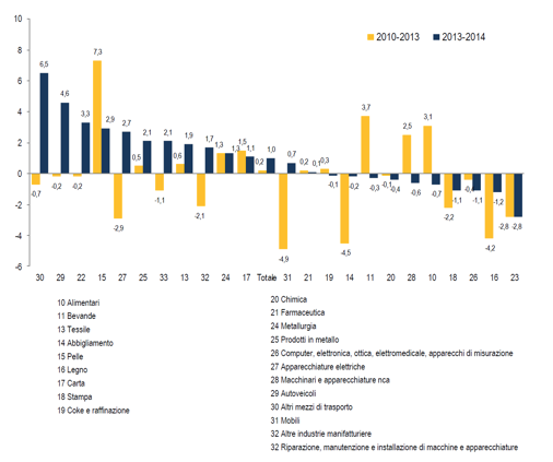 Alcuni settori manifatturieri hanno migliorato un andamento già positivo (tessile, articoli in pelle, carta, metallurgia, prodotti in metallo); altri hanno interrotto una performance precedentemente positiva (alimentari, bevande, prodotti chimici, macchinari); in altri casi si è avuta una ripresa dopo un quadriennio di difficoltà (articoli in gomma e plastica, apparecchiature elettriche, autoveicoli, altri mezzi di trasporto, altre industrie manifatturiere, riparazione e manutenzione); un ultimo gruppo di settori ha peggiorato ulteriormente o non ha compensato le perdite passate (articoli di abbigliamento, industria del legno, stampa, computer, mobili).