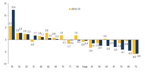 Figura 2 – Variazione percentuale mediana del fatturato totale nelle imprese dei servizi, per divisione di attività economica – Anni 2013-2014 (gennaio-settembre) e 2010-2013 (media annua)