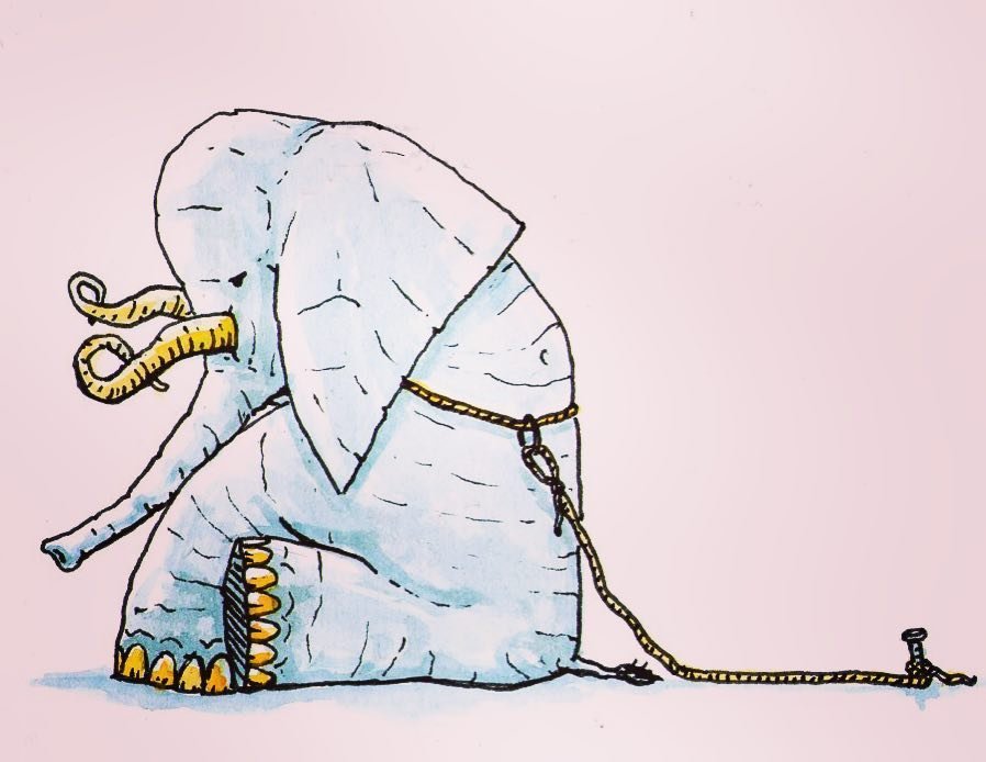 Finché un giorno, un giorno terribile per la sua storia, l’animale accettò l’impotenza rassegnandosi al proprio destino. L’elefante enorme e possente che vediamo al circo non scappa perché, poveretto, crede di non poterlo fare. Reca impresso il ricordo dell’impotenza sperimentata subito dopo la nascita.