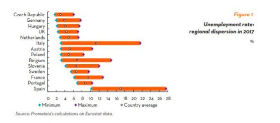 Anche Prometeia ha dedicato la sua ultima discussion note alle disparità economiche regionali, evidenziando che l’Italia non può raggiungere tassi di sviluppo sostenuti se il Mezzogiorno non accelera il passo. Dalla sua nota si evincono alcuni tratti significativi dei divari. Se osserviamo la disoccupazione ad esempio, insieme alla Spagna rappresentiamo un’anomalia rispetto ai partner europei in termini di dispersione territoriale del fenomeno.