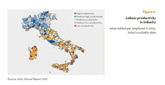 Secondo Emanuele Ciani, Andrea Locatelli e Marcello Pagnini (Banca d’Italia), a livello di produttività totale dei fattori nel settore manifatturiero, «Il forte svantaggio delle regioni meridionali è dovuto, oltre che alla diversa qualità del fattore lavoro, anche alla composizione settoriale e alla dimensione più ridotta delle imprese meridionali».
