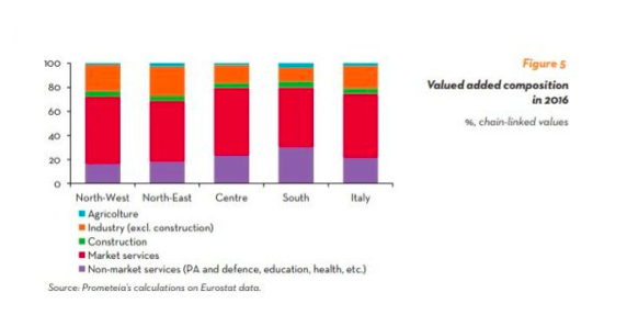 La situazione è aggravata dal mercato del lavoro, poiché «Tra gli aspetti che caratterizzano la struttura produttiva italiana rispetto a quelle degli altri paesi europei, vi è un minore utilizzo di forza lavoro qualificata. Tale dato è ancora più accentuato nel Mezzogiorno, le cui imprese hanno una minore incidenza di addetti in possesso di una laurea e che svolgono professioni a elevata qualifica». Il tutto in un’economia ancora troppo dipendente dal settore pubblico e caratterizzata da imprese di piccole dimensioni, soprattutto nei servizi, a basso valore aggiunto.