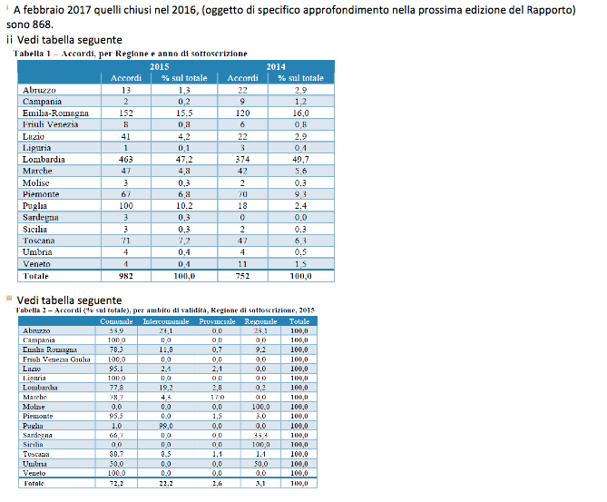 2. Gli accordi raccolti e classificati nell’archivio dell’Osservatorio Sociale sono oltre 5 mila. Quelli del 2015 ammontano a 1002. E’ la Lombardia la regione con maggior numero di accordi (il 47,2% del totale nel 2015), seguita, in ordine decrescente: Emilia-Romagna (152 accordi, pari al 15,5% del totale), Puglia (100, 10,2%), Toscana (71, 7,2%), Piemonte (67,6%), Marche (47, 4,8%) e Lazio (41, 4,2%).