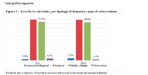 4. Gli accordi solo marginalmente sono sottoscritti dalle associazioni imprenditoriali. Nella maggioranza dei casi firmatari sono le tre confederazioni sindacali. E’ da evidenziare lo scarso coinvolgimento, almeno all’atto della stipula, del Terzo settore che pure risulta essere un alleato sociale in molte degli interventi di politiche territoriali.