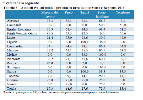 Come sono distribuite le tematiche su base regionale? In Puglia la quasi totalità degli accordi (96,0%) insiste sull’area mercato del lavoro; in Piemonte e Toscana vi è una percentuale molto elevata, rispettivamente pari al 93,7% e 89,1%, di intese che ruotano attorno ai temi del fisco; in Liguria e Sicilia tutti gli accordi vertono sull’area sanità; in Sardegna, Molise, Liguria, Lombardia e Marche quasi tutti gli accordi si riferiscono alle politiche socio-familiari; nelle Marche e in Emilia-Romagna la prevalenza di accordi riguardano le politiche per il territorio.