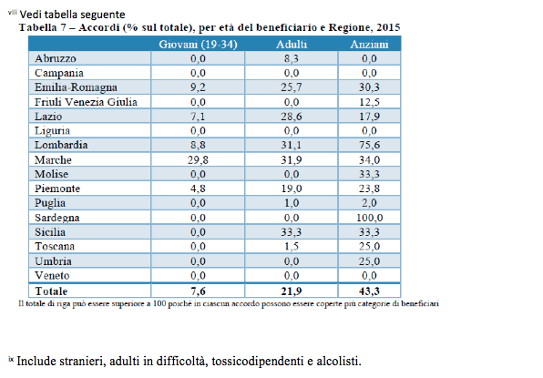 Nel 2015 quasi la metà (43,3%) degli accordi è destinato agli anziani (autosufficienti o non autosufficienti) ultra 65enni; il 21,9% agli adulti (adulti 35-65 anni e adulti in difficoltà); ai giovani il (7,6%).
